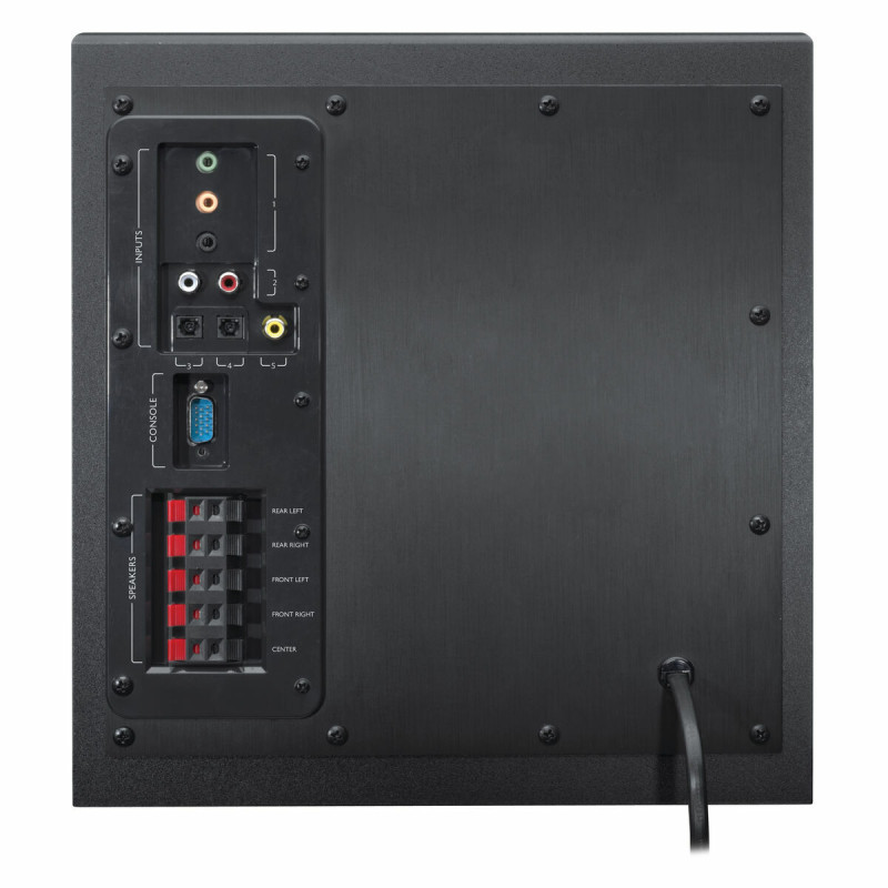 The Logitech 980-000468 PC speaker system delivers an immersive, high-fidelity audio experience, ideal for users seeking professional sound quality in home or work environments. This 5.1 set provides a true power output of 500 W RMS and up to 1,000 W peak, ensuring powerful sound with deep bass and clear details from anywhere in the room. It holds THX, Dolby Digital, and DTS Digital certifications, guaranteeing accurate and faithful playback of both music and movie tracks, highlighting its decoding capabilities and compatibility with multiple digital formats. The satellite speakers and center speaker each offer 67 W RMS power and feature compact dimensions (approximately 100 x 93 x 166 mm) and a weight close to 890 grams, facilitating placement and mounting, including wall mounting, thanks to their design for versatile setup. The subwoofer, weighing 9 kg with 165 W RMS power, provides a solid, rich low-frequency foundation, with dimensions suitable for integration into any space. Regarding connectivity, the system supports multiple simultaneous inputs, including 3.5 mm jack, RCA, direct six-channel inputs, and both coaxial and optical digital connections, allowing connection of up to six compatible devices with great flexibility. Input selection and system control can be conveniently done from the console or via the included remote control, which adds comfort and functionality by enabling independent volume adjustments for each speaker and the subwoofer, as well as power and mute controls. The black design offers a sober, professional finish, with speakers that include batteries for the remote and facilitate wall mounting, adapting to different room configurations. This system is powered by AC with a type C plug, ensuring standard compatibility. In short, the Logitech 980-000468 is an advanced system combining power, versatility, and certified quality for those seeking immersive, detailed sound in demanding multimedia applications.