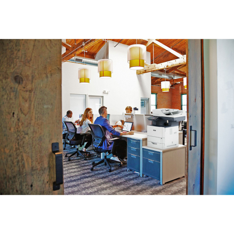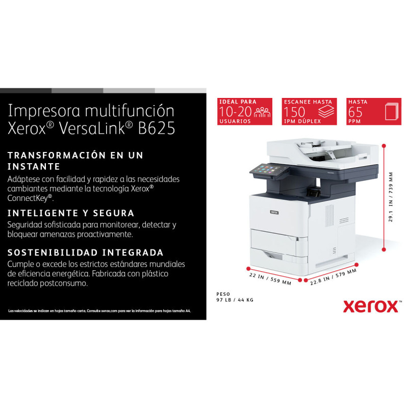 The Xerox B625V_DN is a multifunction laser printer designed for demanding work environments that require efficiency and versatility in a compact size. This printer stands out for its high speed, with a printing capacity of up to 61 pages per minute, making it an ideal solution for large volumes. Equipped with monochrome laser printing technology that ensures sharp, professional text thanks to a maximum resolution of 1200 x 1200 dpi, this multifunction device includes advanced features such as printing, copying, scanning, and automatic duplex fax, facilitating comprehensive and efficient workflows. Its scanning system offers an optical resolution of 600 x 600 dpi, with duplex scanning capability that speeds up document digitization without manual intervention. Additional features include a built-in color display for intuitive navigation and a personalized user experience, as well as an installation guide for easy setup. Its paper handling is versatile, with two trays totaling a capacity of 650 sheets, supporting sizes up to A4, adapting to various document types and print volumes. Connectivity supports widely used printing languages such as PS3 and PCL5e/6, ensuring compatibility with multiple systems and office environments. Furthermore, the device offers a color fax system and full duplex functions for copying, scanning, printing, and faxing, optimizing document management and reducing paper consumption. The sober design in black and gray tones allows seamless integration into any professional setting. In summary, the Xerox B625V_DN is a robust and flexible multifunction printer that combines performance, functionality, and ease of use for organizations seeking a complete, future-ready solution.